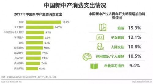 6月底,艾瑞咨询发布的《新中产精神消费升级报告》指出,新中产2017年的主要消费领域中,旅游位居占消费支出的18.7%,位居榜首;休闲娱乐/个人爱好也达到了总消费的9.7%,排列第三位,仅次于旅游和子女教育费用。这表明新中产对精神消费的需求日趋强烈。