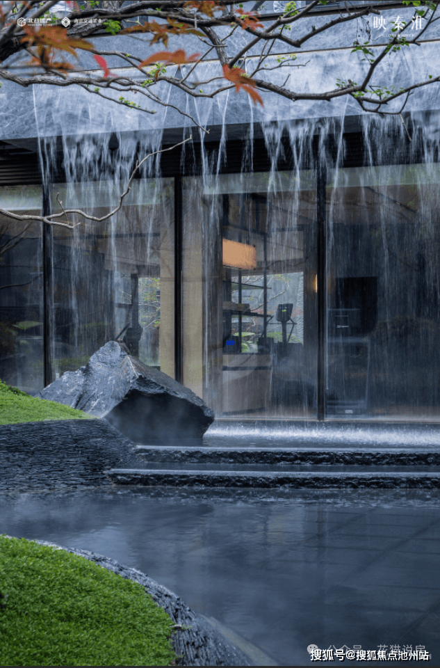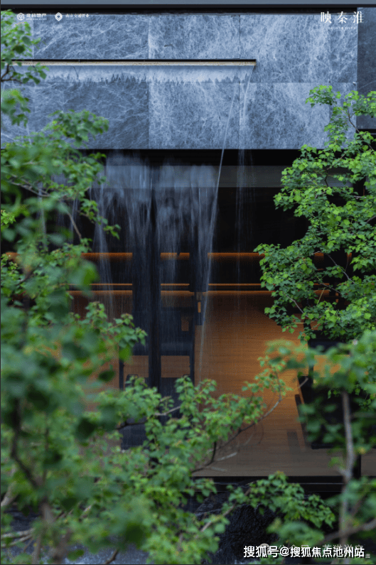 当你打开主入口大门,你将会看到一个通透的世界。大幅落地玻璃窗外,景石与水光树影动静结合,创造出无限的诗意与禅意。一片瀑布从高处跌落,悦耳的声音为整个庭院平添了些许生动。