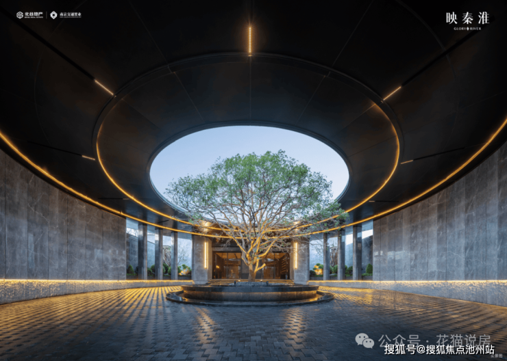 它的设计灵感源自南京六朝古都的礼制文化“一进登门望府,二进穿庭入画”,约百米宽、7米高的超常规尺度主入口, 扩大了整个楼盘的封面, 它的用材尽显奢侈——