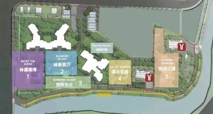 整个滨水园林包括了5大功能区,主入口的林溪港湾、拾阶云台、漂浮会客庭院、亲子儿童乐园(即溪谷花园)、配置羽毛球和篮球场的悦动之港,真正做到了一步即一景。
