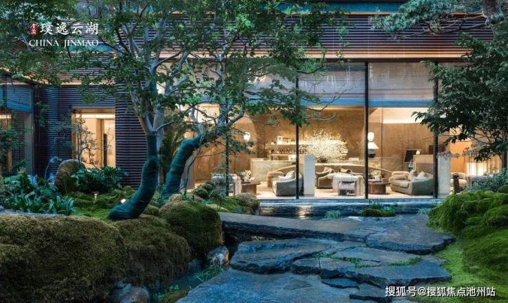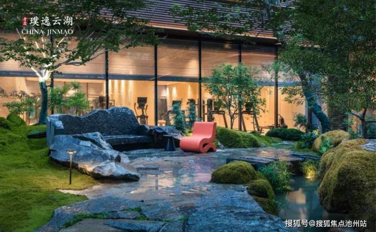 移步下沉庭院,叠瀑水景如脉络般串联起山、台、石、林、池,宛然一幅立体的水墨盆景跃然眼前。