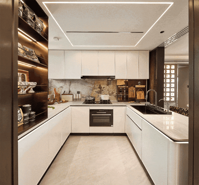 譬如说部分柜体更安全的圆角处理、高柜顶部一窥到底的镜面反光膜、大大提高空间利用的薄抽,不用弯腰一踢即开的踢脚抽设计,便利性大大增加;