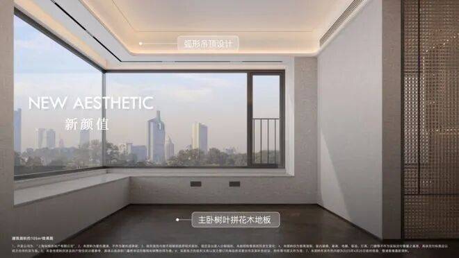 项目大量使用奢石设计,客厅四边弧形天花、主卧树叶拼花地板、精致优雅的骨骼线设计,都是开发商花费更大成本和耗材去呈现更美的视觉体验。