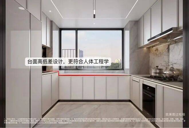 部分户型厨房台面还做了高低台设计,这是上海新房市场上从来没有过的突破,让整个厨房动线更加合理,也减少了长时间弯腰带来的不适感,充分考虑到了未来居住的舒适性,这种产品颗粒度真的令人惊艳!