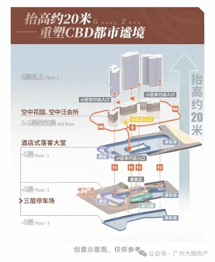 利用地形上的高差,形成了三层归家动线,这在珠江新城的豪宅当中,应该是首创了,较好的进行人车分流。