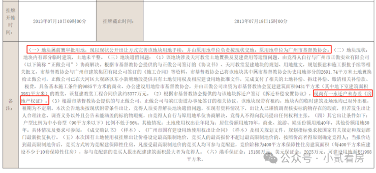 原来,这地块原用地单位为广州市基督教协会,招拍挂时地块仍涉及天河教堂土地置换及复建费用、带租约的临时建筑等遗留问题,且地块内尚有未办妥拆迁补偿协议也待协商解决。
