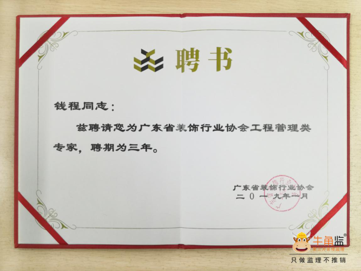 加入到广东省装饰行业协会的专家团队,意味着牛角监装修监理成为监理行业的“领军人”,将带领更多的行业专业人士,在装饰装修工程管理和检查验收规范等方面做出更多贡献。
