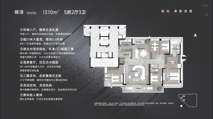 建面约310㎡户型,做出了超20米的南向大面宽,全面屏采光。约11.8米宽景阳台,成为天然的取景器,而每一个转身,也都能与明媚的阳光不期而遇。
