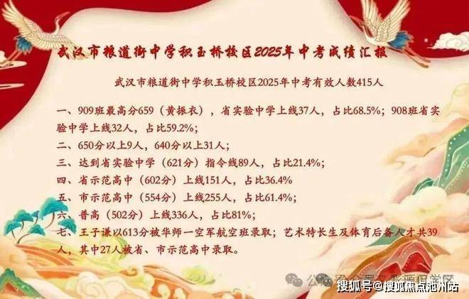 2021年,粮道街积玉桥校区普高率55%;2022年,普高率62.7%;2023年,普高率64.5%;2024年,普高率70.2%;2025年,普高率81%,示范率61.4%,这个成绩在整个武昌来说都是排名前列,成功冲进一梯队。