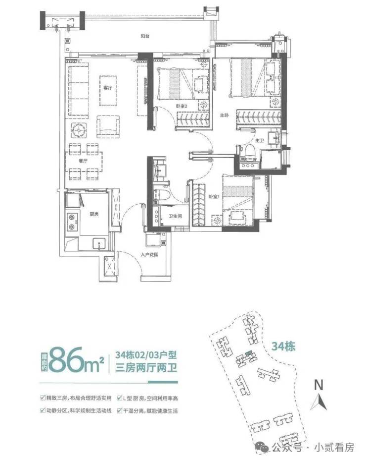 此次广地花园·观灏加推的新品34栋悦景楼座,面积段分别为86m²、96m²、100m²悦景三房,多面采景,三面望水,通透采光,充分利用户型的每一寸肌理,以有限的生活空间焕发更多生活灵感,打造全方位人性化居所。