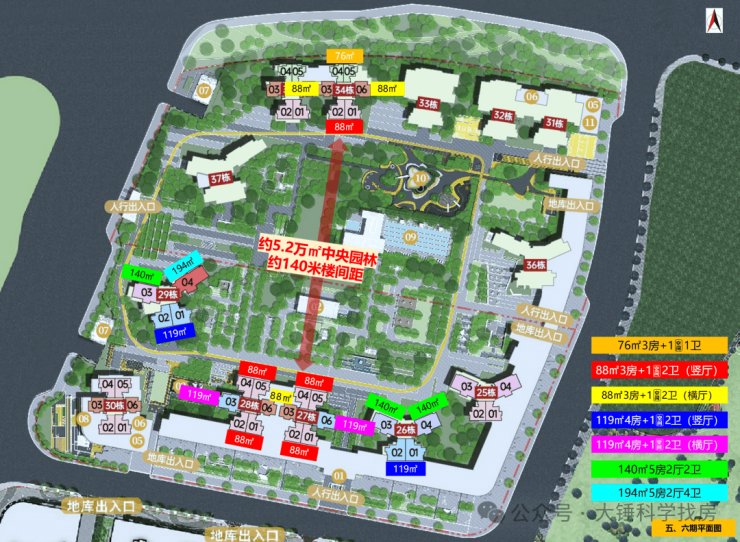 【楼间距】五六期园林南北楼距约140米,东西楼距约145米,视野景观开阔