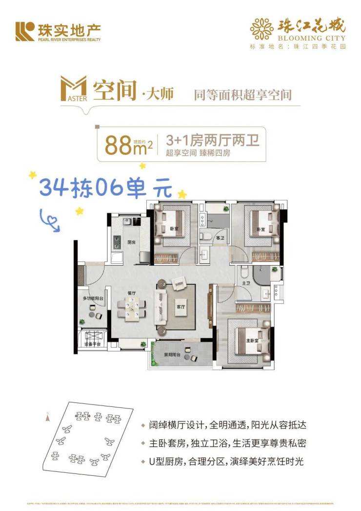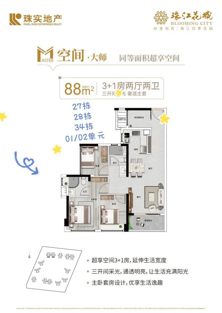 珠江花城规划分六期开发,目前正在加推六期34栋,26层高的小高层,户型以88㎡3+1房为主,首次推出南向望花园的房源,市场反响热烈。