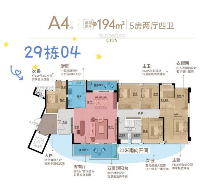 194㎡五房2厅4卫(南北对流)奢阔五房大平层,双景观阳台南北通透,观景生活两不误。