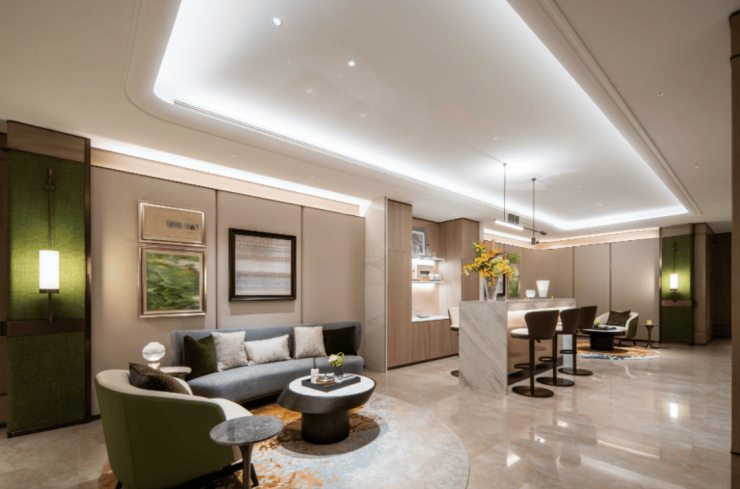在这里,你既能看到远超业内常规尺度的约13米挑高,也能看到来自于杭州金色竹林意象的木色基调“暖装修”。其与建筑外立面形成呼应,充满盎然向上的生命力和温润质感,点缀以“玉琮青”大理石,既显矜贵又不失人文关怀。在这里,大堂将真正成为回家的过渡,成为生活的一部分。
