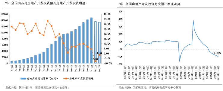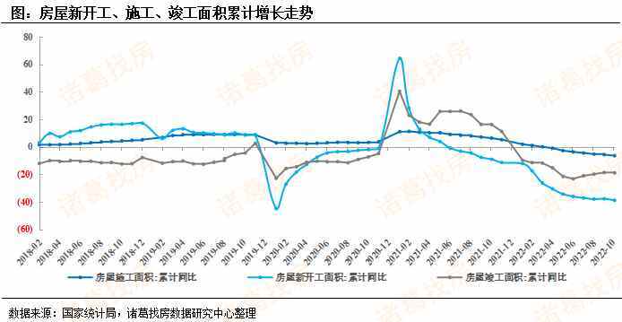 开发投资增速持续走弱,保交付下竣工同比降幅收窄。2022年,受到行业环境低迷,市场信心偏弱等影响,房地产基本面持续走弱,根据统计局数据显示,开发投资增速自2021年3月开始连续20个月收窄,至2022年4月同比开始转负,2022年11月房地产开发投资同比降至-9.8%。从单月数据上看,11月单月房地产开发投资额为9918亿元,环比下降4.5%,环比降幅较上月收窄14.03个百分点。整体来看,行业投资信心仍然低迷,随着近期以来金融端多措并举支持房地产,开发投资数据呈现出向好的迹象。从新开工、施工、竣工来看,新开工降幅最大,新冠疫情影响以及集中供地模式下,新开工意愿持续低迷。而在“保交楼”的推动下,竣工面积降幅自8月开始连续3月收窄。根据国家统计局数据,2022年1-11月新开工面积同比下降38.9%,施工面积同比下降6.5%,竣工面积同比下降19%。开工施工意愿不足导致开发投资增速低位徘徊。随着疫情管控逐渐放开,但受制于土地成交规模缩减、企业资金压力等因素,预计未来一段时间内仍将维持新开工走弱,同时竣工表现相对良好,2023年竣工有望实现正增长,将会对开发投资形成支撑。