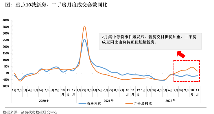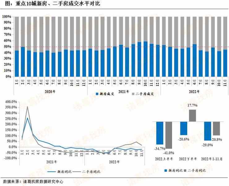重点城市二手房修复速度快于新房。2022年,房地产行业下行压力加大,新房和二手房销售端都面临着不同程度的冲击,根据诸葛找房数据研究中心监测数据显示,2022年1-11月重点10城新房成交同比下降29%,二手房成交同比下降20.8%,与此同时,下半年新房成交同比下降20.6%,二手房成交同比上涨17.7%。可以看出,二手房市场在下半年加速修复,成交水平已经赶超去年同期,而新房市场虽然同比跌幅较上半年收窄,但是仍未恢复到去年水平,二手房修复速度快于新房市场。
