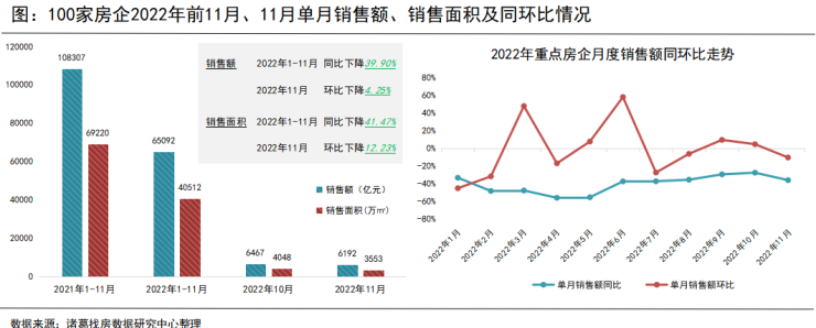 房企销售乏力,11月修复放缓。根据诸葛找房数据研究中心选取的100家重点上市房企,2022年1-11月销售金额为65092亿元,较去年同期下跌39.90%;销售面积为40512万平方米,同比下跌41.47%。2022年前11月房企销售业绩不及去年同期,这也是在预料之内的,全国大范围内疫情反复在一定程度上阻碍线下楼市销售活动,企业项目回款压力持续蔓延,同时,市场就业环境受挫,居民收入预期减弱,楼市购买力随之下降。除此之外,部分房企爆发流动性危机,市场担忧情绪犹存,房企品牌形象的支撑力不足,项目“买账”面临一定难题。