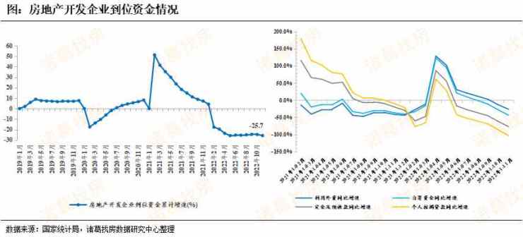 销售端拖累下房企到位资金压力仍较大,三箭齐发后续效果待兑现。根据国家统计局数据显示,1—11月份,房地产开发企业到位资金136313亿元,同比下降25.7%,降幅扩大1个百分点。销售回款是房企重要的资金来源,受到销售端拖累,房企到位资金压力仍然较大。