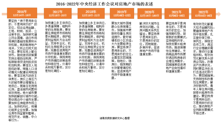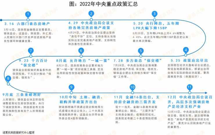 宽松基调贯彻全年,年末迎来政策拐点。2022年以来,中央端政策导向以宽松为主,从年初开始多轮支持房地产的利好政策轮番出台,渐进式宽松持续上演。中央政策调整主要分为四大阶段:第一阶段为1-3月份,在此期间,中央端出台政策频率较低,宽松信号尚不明晰,期间央行宣布年内首次降息,1年期LPR下调10个BP,5年期LPR下降5个BP;3月16日,国务院金融稳定发展委员会、银保监会、证监会、财政部等六部门相继表态,促进房地产业良性循环和健康发展,释放出积极信号。第二阶段,进入4-6月份,高层对房地产的发声逐渐增多且更加明晰,以4月29日中央政治局会议为重要标志,提出支持刚性和改善性住房需求,促进房地产市场平稳健康发展。5月20日,5年期LPR下调15个BP,创历史以来最大降幅。第三阶段,7月烂尾风波愈演愈烈,销售端遇冷,政策重点开始转向“保交楼、稳民生”,7月28日中央政治局会议强调要稳定房地产市场,因城施策用足用好政策工具箱,支持刚性和改善性住房需求,压实地方政府责任,保交楼、稳民生。随后银保监会等部门接连发声,千方百计推动保交楼。第四阶段,以930三条重磅利好为标志,对房地产的支持力度加大,进入11月,金融端祭出组合拳,双十一当天金融16条托底楼市,力度达到空前高度,加之支持房企融资的三支箭齐发,且时隔12年再度重启“借壳上市”,政策开始由“保项目”向“保主体”过渡。12月以来,以中央经济工作会议的召开为重要开端,保稳定、化风险成为主要任务,同时确定了“推动房地产业向新发展模式平稳过渡”的目标。随后,高层多次表态明确“房地产是国民经济支柱产业”的地位,充分认识到房地产行业的重要性,政策面迎来真正的曙光,指明了未来房地产的发展方向和战略地位。预计2023年中央政策将会继续托底,整体政策环境仍会延续宽松态势,或将会迎来新的配套政策辅助房地产向新发展方式过渡。