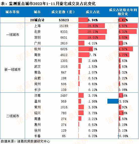 市场低迷行情下豪宅市场保持强韧性。2022年房地产市场萎靡不振,销售端回温之路波折不断,然而在这样的行情下,重点城市豪宅市场异军突起。根据诸葛找房数据研究中心监测数据显示,2022年1-11月重点20城豪宅成交53623套,占总成交量的比重为6.94%,较2021年同期扩大2.47个百分点。20城中仅有温州和长春豪宅成交占比有所下滑,其他18城豪宅成交占比呈现不同幅度的上升。