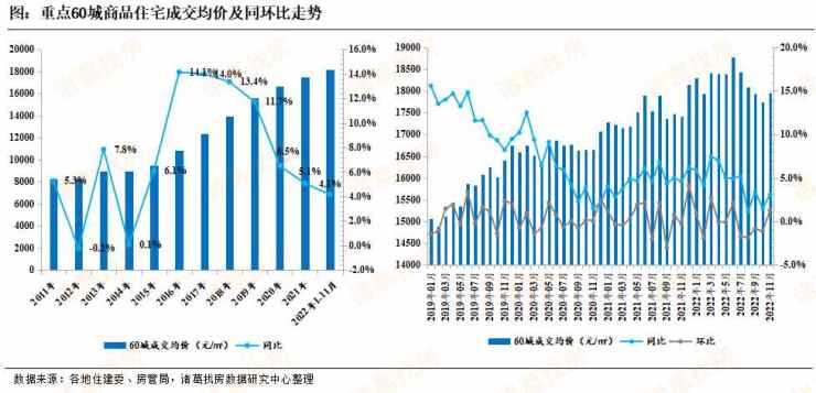 新房价格涨幅创近6年新低,环比连续多月下滑后年末翘尾。根据诸葛找房数据研究中心监测数据显示,2022年1-11月重点60城市新房成交均价为18206元/㎡,同比上涨4.2%,涨幅较去年收窄0.9个百分点。新房成交同比连续6年收窄,价格上涨动力略显不足。上半年,在越来越多城市出台利好政策下,购房积极性提升,带动新房价格稳中有升,随后,7月以来,部分城市烂尾楼停贷潮事件、经济下行压力加大、居民收入预期下滑等影响,成交活跃度下降,房企打折促销行为增加,成交均价波动下行,年末呈现小幅翘尾态势。
