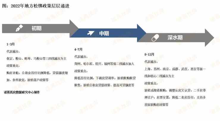 整体来看政策调整大体分为三个阶段:初期,出台城市主要是以马鞍山、保定、株洲、蚌埠等三四线城市为主力,这部分城市多属于基本面较弱、房地产欠发达的城市,政策松绑力度较弱,产生的实际政策效应有限。二季度开始,政策松绑进入中期,出台政策的城市逐步扩展至部分弱二线城市,如南宁、兰州、郑州、昆明等,多存在库存压力大、去化缓慢的难题,政策出台相对密集,达到全年的高峰,短期内对促进去化、缓解观望情绪起到一定的效果,但是各城市间效应分化。8、9月份以来,调控政策逐步迈入深水期,出台政策主体开始转向重二线和新一线城市,南京、苏州、杭州、成都、重庆等核心二线城市陆续出台优化限购及“认房又认贷”的政策,进入12月以来,佛山、东莞等城市继续加大松绑力度,宣布全面取消限购,这也意味着新一轮的松绑拉开序幕。预计接下来将会有更多热点二线城市跟进取消限购,购房限制性政策尤其是“五限”政策加速调整或取消将成为2023年房地产政策调整的重要趋势。展望后市,除了一线城市外,二线及三四线城市有望全面取消“四限”,部分核心二线城市或将会采取从局部到全市的循序渐进方式放松。