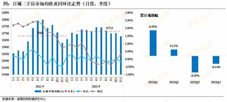 2022年百城二手房价格“前稳后跌”,下半年房价下行压力加大。上半年,多城发布宽松政策,市场底部回升,加之小阳春效应下,市场价格波动回升,7月份达到年内峰值,市场均价为15746元/㎡,环比上涨0.19%,同比下降0.3%。在停贷风波干扰下,市场信心萎靡不振,加上多城疫情反复、管控趋严,购房者观望情绪加重,市场均价连续多月回落,根据诸葛找房数据研究中心监测数据显示,2022年11月百城二手住宅市场价格为15679元/㎡,环比下跌0.14%,同比上涨0.3%。分季度来看,一季度市场价格累计上涨0.45%,二季度涨幅逐渐收窄,三季度市场下行压力继续加大,市场均价累计下跌0.29%,到四季度中央出台16条金融政策托底楼市,金融端持续放宽,市场信心有所提振,累计降幅有所收窄。