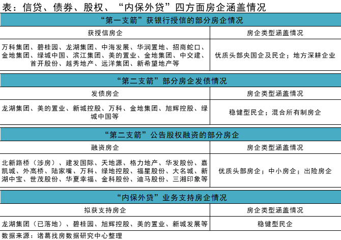 “第二支箭”债券融资支持主要涉及稳健型民企及混合所有制房企,截至目前已有8家房企向交易商协会申请储架式发行,所获额度达到1210亿元,其中龙湖200亿元及美的置业、新城控股各150亿元的发债资金已落地。随后支持房企股权融资的“第三支箭”的适用对象更为广泛,优质头部房企、中小房企以及出险房企均有涉及,截至目前已有万科、绿地控股、世茂股份等在内约34家房企启用“第三支箭”。