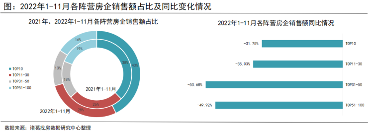 头部阵营房企销售占比上升,抗压能力更强。从各大阵营房企销售额占比情况来看,2022年1-11月TOP30房企销售额占据半数以上份额,合计占比为71%,且TOP10、TOP11-30房企占比较去年同期分别上升5个、2个百分点;TOP31-50、TOP51-100两大阵营房企销售额占比均较去年同期呈下降态势,分别下降5个、3个百分点。整体来看,今年前11月房企销售集中度有所上升,且向头部阵营靠拢,当前房地产市场仍然面临一定压力,中小房企面临的压力更大。