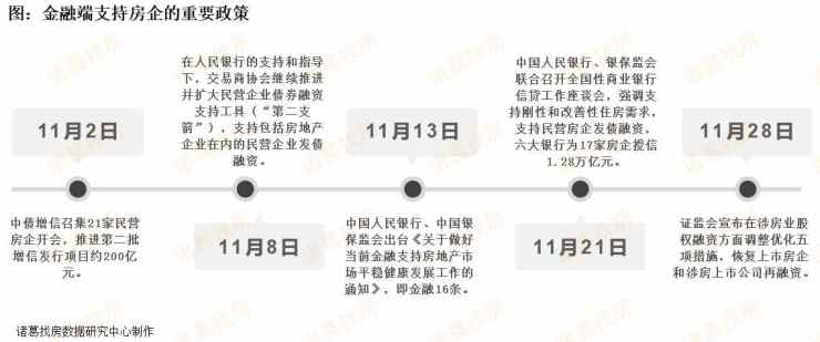 金融端发力,“三箭齐发”释放流动性。从供给端来看,监管部门逐步从“救项目”向“救主体”转变,尤其是进入11 月以来,中央开始全面加强对房企融资的支持力度。11月2日,中债增信召集 21 家民营房企开会,推进第二批增信发行项目约 200 亿元;11月8日,交易商协表示继续推进并扩大民营企业债券融资支持工具(“第二支箭”),支持包括房地产企业在内的民营企业发债融资,预计可支持至少2500亿元民营企业债券融资;11月13日,中国人民银行、中国银保监会出台《关于做好当前金融支持房地产市场平稳健康发展工作的通知》,即金融16条,开启了全国金融机构对房产行业全面的资金支持;11月21日,中国人民银行、银保监会联合召开全国性商业银行信贷工作座谈会,强调支持刚性和改善性住房需求,支持民营房企发债融资,六大银行为17家房企授信1.28万亿元;11 月 28 日,证监会宣布在涉房业股权融资方面调整优化五项措施,恢复上市房企和涉房上市公司再融资。至此,信贷、债券、股权支持全部到位,真正意义上实现“三箭齐发”,房企融资环境进一步改善,对改善房企资产负债和助力行业纾困意义匪浅。
