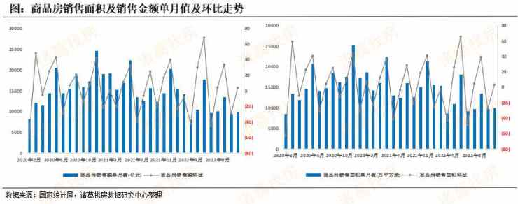 从单月来看,11月商品房销售面积10071万㎡,环比上升3.21%;商品房销售金额9816亿元,环比上升3.84%。11月份销售面积及金额均呈现小幅回升态势。这与近期以来出台的宽松政策有关,加上疫情防控不断优化,市场呈现微幅改善迹象。