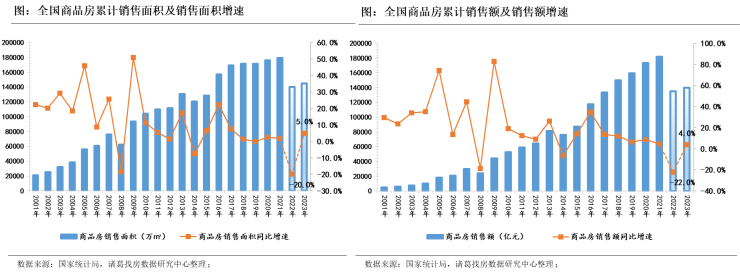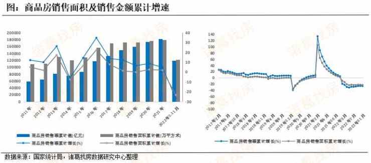 商品房销售下行,销售额创近六年新低。2022年,商品房销售持续下行,根据国家统计局数据显示,2022年1-11月,全国商品房销售面积为121250万㎡,与去年同期相比下降23.3%;商品房销售金额为118648亿元,与去年同期相比下降26.6%。预计全年商品房销售额约13.5万亿元,创自2017年以来的新低。销售面积约14.5万亿元,创自2016年以来新低。一方面今年在疫情冲击下,居民预期收入下降,部分购房需求延迟释放;另一方面,房企信用危机频频爆发,购房者观望情绪渐浓,销售端表现乏力。政策面来看,尽管中央及地方频频发力,多城出台松绑政策,但销售端恢复不及预期,当前需求端仍然偏弱。