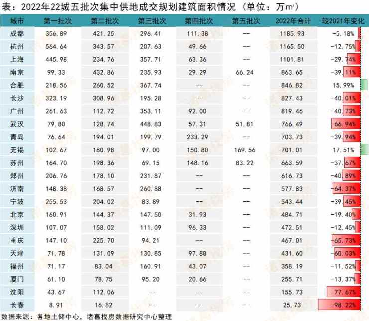 2022年五批次供需规模下滑,多城在年末政策利好加持下第四、五轮热度回升。自去年以来,除去年第二轮集中供地供应显著增加外,整体供需两端大致呈现逐批次递减态势,今年集中供地模式发生转变,供需两端呈现先稳后降的态势,全年五批次供需规模较去年下降,根据诸葛找房数据研究中心监测数据显示,2022年重点22城五批次集中供地供应规划建筑面积共16393.34万㎡,较去年三批次合计下降50.33%;成交规划建筑面积共14034.61万㎡,较去年全年下降42.02%。此外,对比各城市今年与去年的集中土拍成交情况来看,截至目前,22城中有20城供应量下滑,其中有6城降幅过半,仅有合肥、无锡2城成交规模赶超去年。