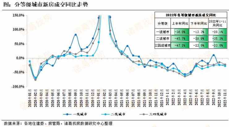 一线城市同比降幅小于二线、三四线,年底近半数城市触底回升。从重点监测60城来看,2022年1-11月份,一线城市成交同比下降20.1%,二线城市同比下降35.3%,三四线城市同比下降33%。整体来看,各等级城市全线下跌,一线城市跌幅最小,在较低行情下韧性凸显,上半年一线城市同比降幅呈现扩大趋势,到下半年,受到中央端政策松绑频率增加的影响,市场信心有所恢复,前期积压的需求逐步释放,同比降幅波动收窄,同比下降13.3%;二线城市上半年同比下降45.7%,下半年同比降幅收窄至29.9%;三四线城市上半年同比下降47.2%,下半年同比下降23%,降幅收窄24.2个百分点。