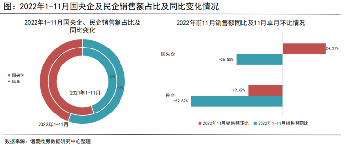 国央资房企销售占比上升,11月单月环比现涨。从各性质房企销售情况来看,具有国央资背景的房企更具韧性,根据监测数据显示,2022年1-11月国央企销售额同比降幅相对较小,低于30%,且今年前11月销售占比份额较去年上升11个百分点,民营房企同比降幅较大,较2021年1-11月下降52.62%;与此同时,国央企11月销售端加速修复,环比涨幅达24.51%,民企仍处慢修复状态,单月环比降幅近20%。整体来看,国央资背景房企在融资方面较具一定优势,资金链出险率偏低,在今年市场信心不足的背景下,国央企更受市场青睐,销售端较显稳健;与此同时,民营企业资金压力较大,且多数企业暴雷加剧市场担忧情绪,销售端恢复进程较慢。