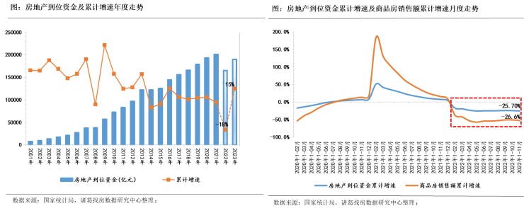 资金面大幅改善,到位资金累计增速10%。2023年预计行业资金面有望改善,一方面,银企之间的合作在2023年实质性落地,第二只箭及第三只箭的扩容,房企资金压力缓解;另一方面,2023年销售逐步回温,销售回款速度加快。从今年的数据看,房企到位资金的降幅小于商品房销售额降幅,2023年房地产到位资金有望先行改善,累计增速预计为10%左右,从而带动投资端改善。