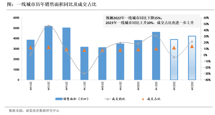 核心城市、核心商圈成交比重上升,2023年一线城市率先复苏。针对城市而言,金字塔效应逐步体现,高能级城市人口聚集效应不断放大,房价中长期可期,三四五线城市不及中心城市,中长期房价上涨动力不足。同一个城市而言,核心区域的更为坚挺,未来潜力相较于郊区更大。从今年的市场看,一线城市在本次下行周期中更为坚挺,且占比连续4年上升。根据诸葛找房数据研究中心数据预测,2022年一线城市商品住宅销售面积大约是3902万㎡,占重点60城的11.8%,较去年下降15%,降幅远小于二线城市及三四线城市。我们预计,2023年一线城市率先恢复,尤其是北京、上海,一线城市凭借丰富的产业配套率先走出下行周期,进入上行周期。