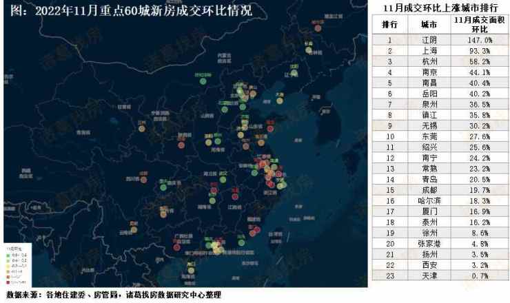从11月重点60城成交环比来看,将近半数的城市已经出现了触底回升的态势,尤其是长三角区域以及部分中部省会城市,其中,江阴环比涨幅超100%,上海环比涨幅也超90%,杭州、南京、无锡、镇江等均涨幅可观。与此同时,省会城市南昌、南京、成都、西安均实现环比正增长,在多轮宽松政策的加持下,这部分城市领衔修复。