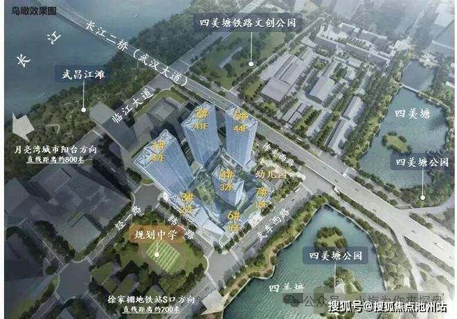 该项目旁边有月亮湾城市阳台、四美塘公园、铁路文创公园、武昌江滩等