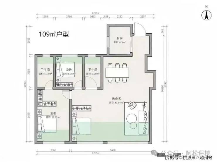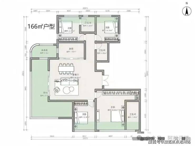 不过,该户型虽然做了三个卫生间,功能性更高,但公卫是个暗卫,主卧位于门口,动静分区弱,略有遗憾。
