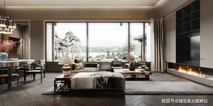 餐客一体的大方厅, 最大约57㎡, 配上中式圆桌, 随时可以呼朋唤友, 来一场隆重的江南家宴。