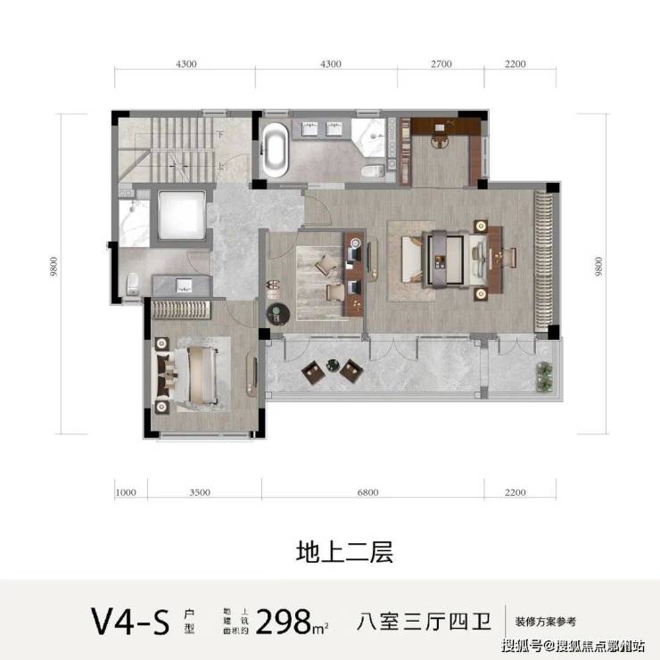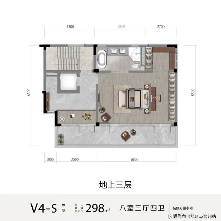 私密又安静的三楼(部分地上两层户型除外), 一整层都是主卧套房,最大约47㎡!主力的建面约200-240㎡户型,还单独设置了主人起居室。