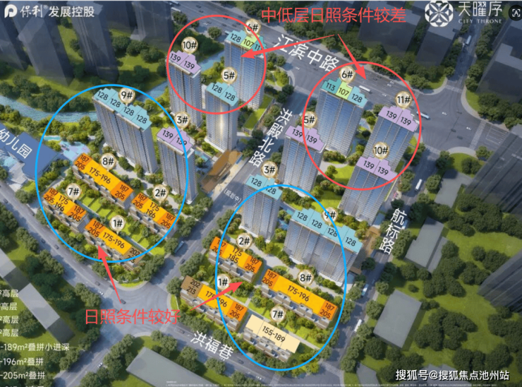 项目总占地约5.54万方,分为东西两个子地块,体量较大,容积率约2.0,由招商&保利联合开发建设,有住宅约752套。小区西侧有一所12班幼儿园。