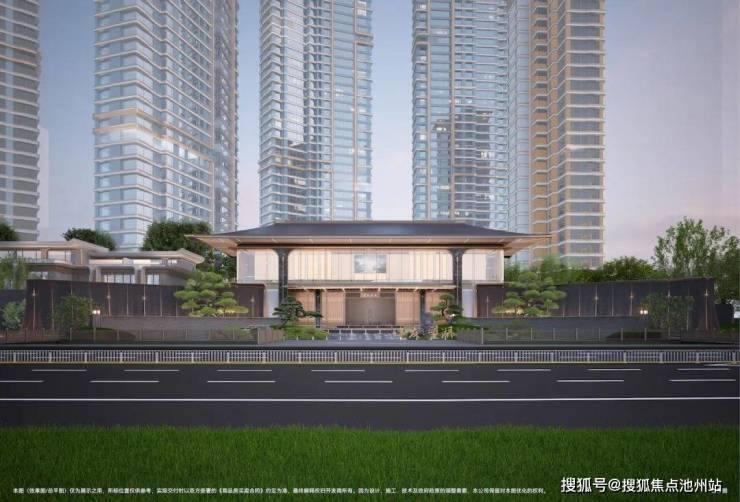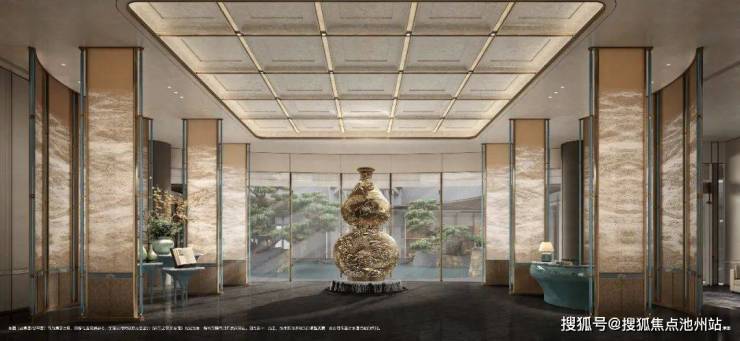 在建筑设计上,暖色系建筑外立面搭配大面积现代的玻璃结构、金属线条、铝板等材料,尽显时尚与质感。项目主入口广场的门楼选用古代帝王才能用的 “庑殿顶”,彰显尊贵大气,堪称沙湖豪宅的 “豪门” 代表。住宅屋顶采用古铜色 “飞檐”,与立面的古铜横竖勾线、高颜值玻璃幕墙构成「飞檐屏」,使整个建筑呈现出屋顶飘逸、屋身轻盈的独特美感,宛如一件件立体的奢侈品。