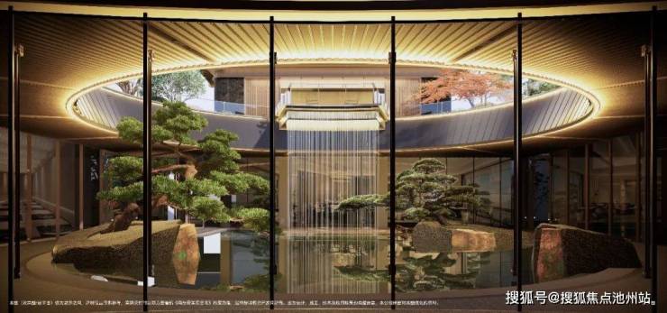 小区的中心园林景观与会所借鉴古人 “天圆地方” 哲学思想。会所一层为方形,顶部镂空圆形天井,地势抬高;二层为圆形,登临即可望湖。中心景观、地下庭院、屋顶花园、风雨连廊等共同组合成一套立体的诗意游园系统,让业主仿若置身于东方山水画卷之中,实现 “内得东方山水,外望大江大湖” 的惬意生活。