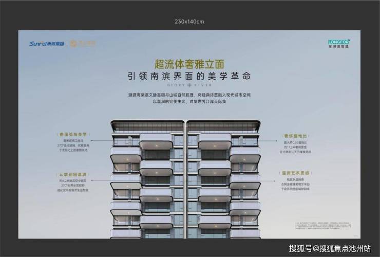 270°曲线弧度美学,构建超流体奢雅立面,毫米级精工细节、奢宅级窗地比、大面积光感玻璃,精致双层线条,搭配古铜金+葡萄牙米白的色彩点缀,传达出超越时间的雅奢质感。