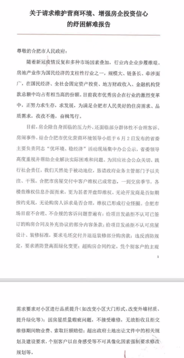 文件称,合肥市房屋交付中, 普遍有不合理、不合规的客户诉求问题,因房屋质量瑕疵问题,不接受维修,无故拒收且拒交维修期间的物业费,索取巨额赔偿。 客户诉求高度一致,背后可能有专业房闹机构推波助澜,并形成产业化趋势。因此,恳请合肥市政府坚决遏制专业房闹及“恶意维权 ”行为。