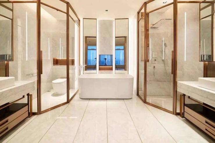 这里有18000元/㎡的装标,有从瑞士V-ZUG、德国汉斯格雅、唯宝到伯格曼的全进口厨卫,有从墙上的雀眼木、软硬包到地上卡拉拉白大理石的铺装,连公区装标都高达2万/㎡,电梯厅全石材铺装,楼层公区选用与深圳湾一号同款的阿曼玫瑰石材。