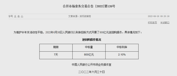 焦点财经讯 耿宸斐 为维护半年末流动性平稳,2022年6月30日人民银行以利率招标方式开展了800亿元逆回购操作,中标利率为2.10%,与此前持平。