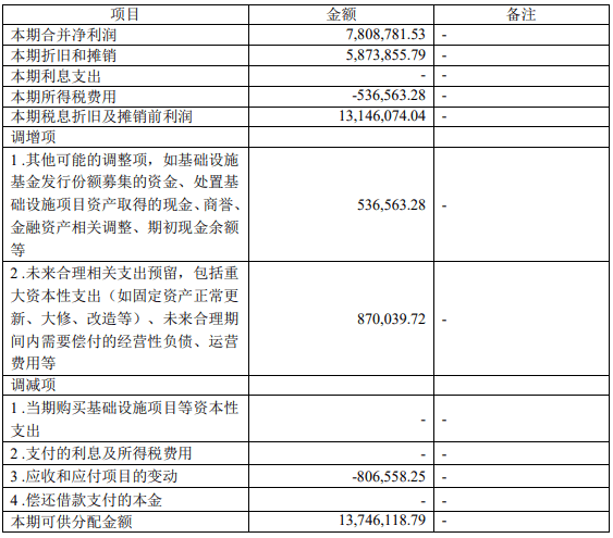 据搜狐财经了解,可供分配金额是在净利润基础上进行合理调整后的金额,相关调整项包括 折旧与摊销、利息支出、所得税费用、应收和应付项目的变动等;以及对未来合理相关支出的预留,包括固定资产正常更新、大修、改造等,及未来需要偿付的经营性负债、运营费用等。